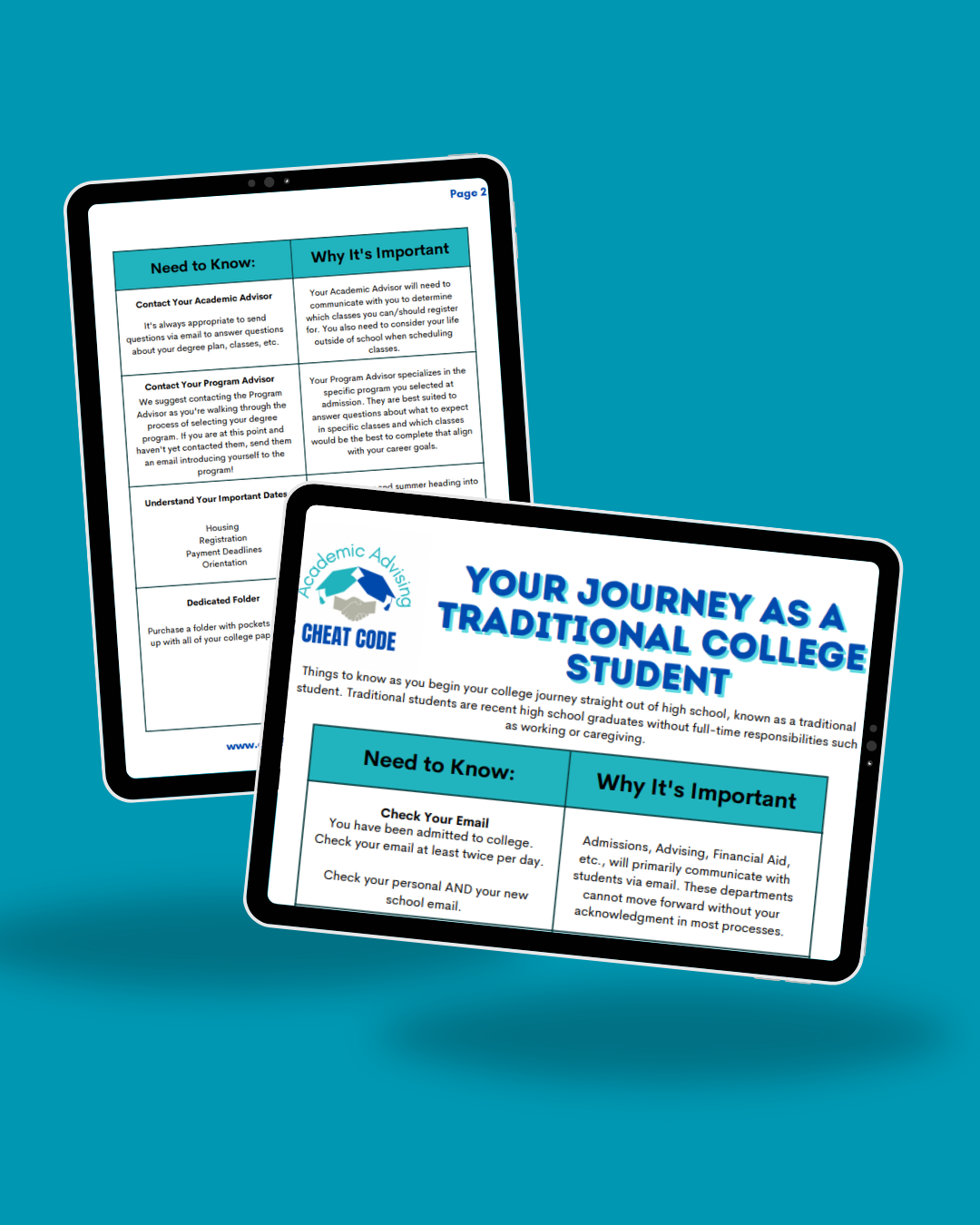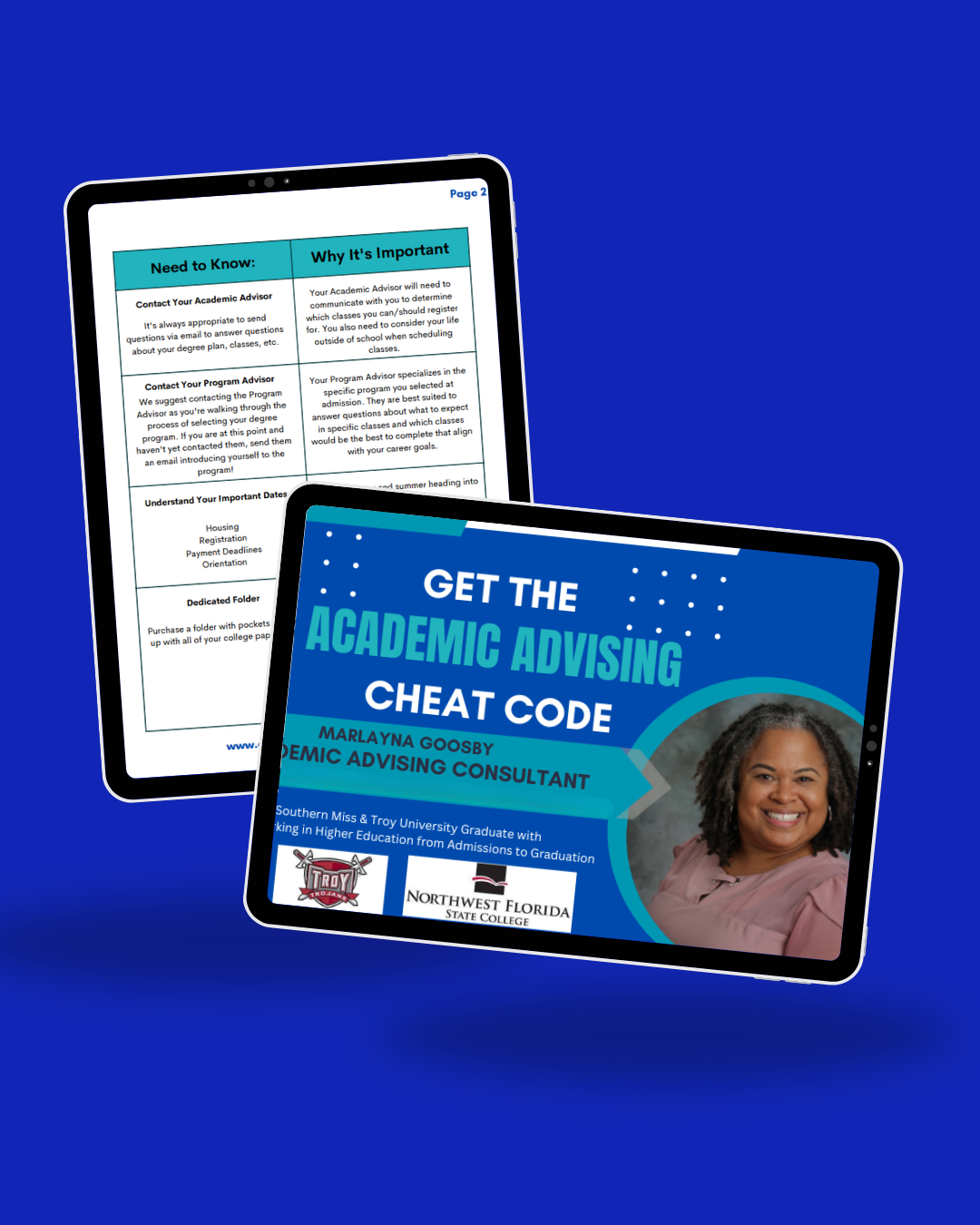 “I was completely overwhelmed helping my high schooler prepare for college. There was a lot of frustration and tears from both me and him. Thankfully, the Academic Advising CHEATCODE gave me the information I needed to help him and now he’s in college thriving, and going to see his Academic Advisor consistently!”